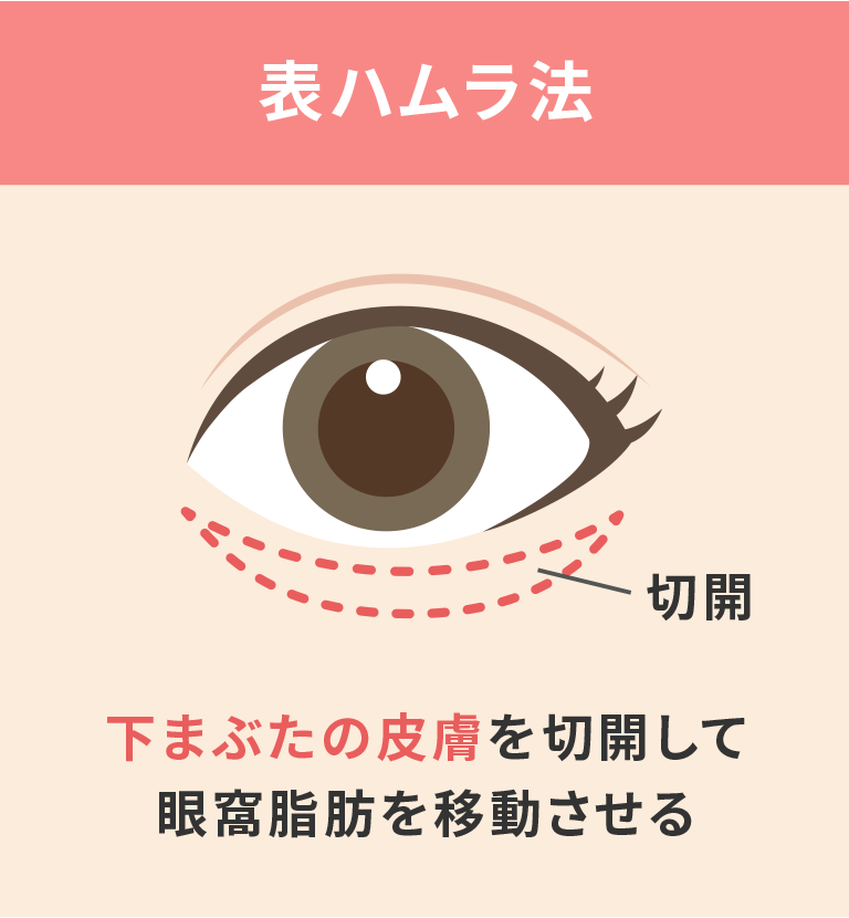 下まぶたの裏側(結膜側)からアプローチするため、お顔の表面には一切傷跡が残りません。施術したことが他の方に気づかれる心配も少ない施術です。